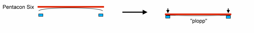 Die Andruckplatte (rot) drückt Film und Schutzpapier - der Einfachheit halber als nur eine Schicht dargestellt (schwarz) - auf die Filmauflageleisten (blau). Es entsteht dadurch die Tendenz des Filmes, sich in der Mitte von der Andruckplatte weg zu wölben. Die Filmoberfläche in der Bildmitte liegt vor der theoretischen Schärfeebene auf den Filmauflageleisten. Der Effekt wird erheblich verstärkt, wenn beim 120er Rollfilm das Rückpapier des Filmes nicht vollkommen glatt ist, sondern wellig oder narbig (z.B. bei Forte). Es entsteht dann ein Federeffekt, der das Paket aus Papier und Film in der Mitte, wo kein Gegendruck erfolgt, aufplustert. Dieser Effekt kann zwischen modernen und älteren Filmen (mit nicht ganz glattem Rückpapier) Unterschiede von 0,2 mm ausmachen! Hier war der 220er Rollfilm natürlich deutlich im Vorteil, da das Rückpapier entfiel.