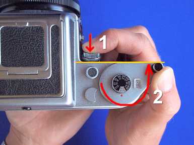 *) With some Pentacon Six cameras a rough feeling (resistance) might be felt when advancing with pressed shutter release button. In this case reduce your finger´s pressing force on the release button just a little.